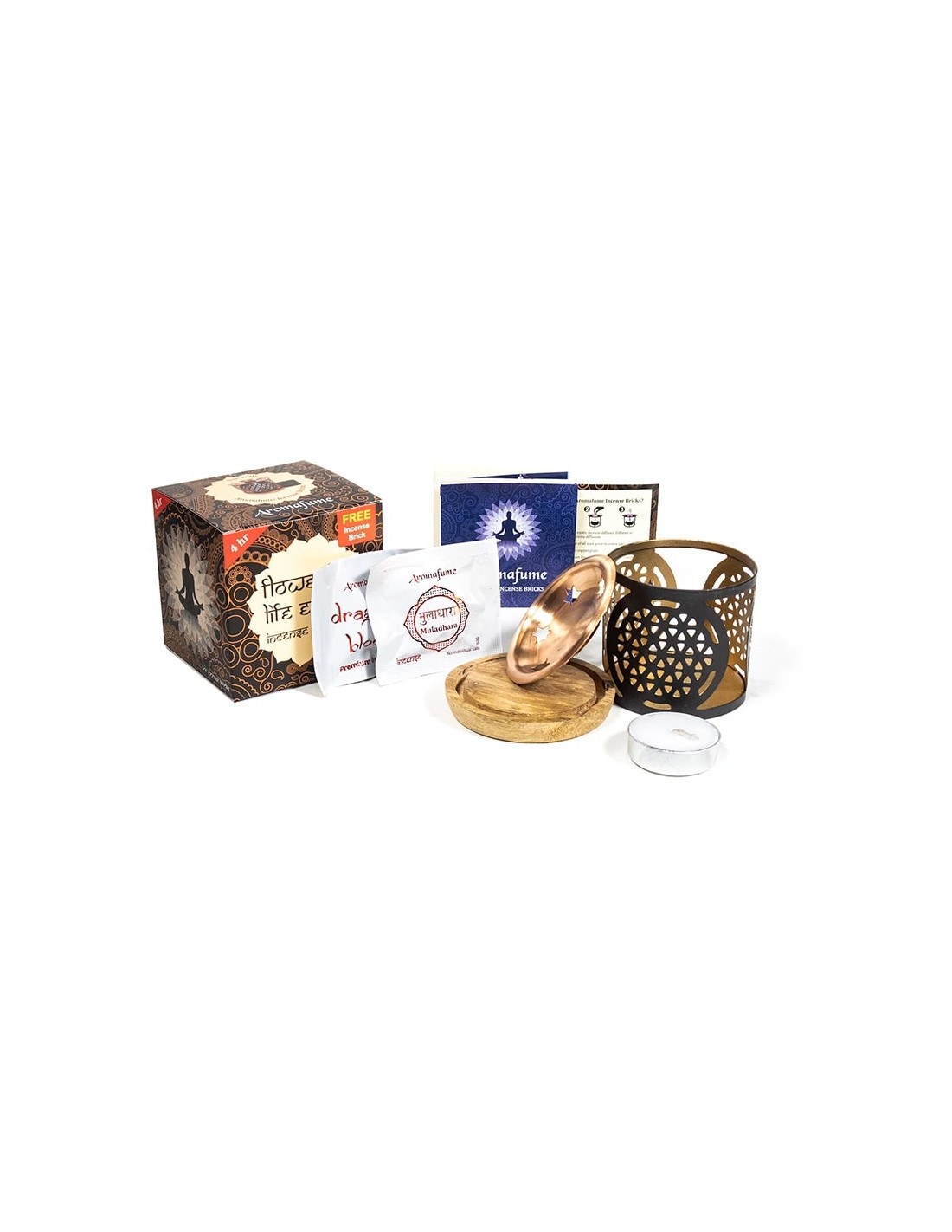 diffusore in ferro battuto, piatto in rame, sottobicchiere in legno, candela, due campioni di mattoncini d'incenso.