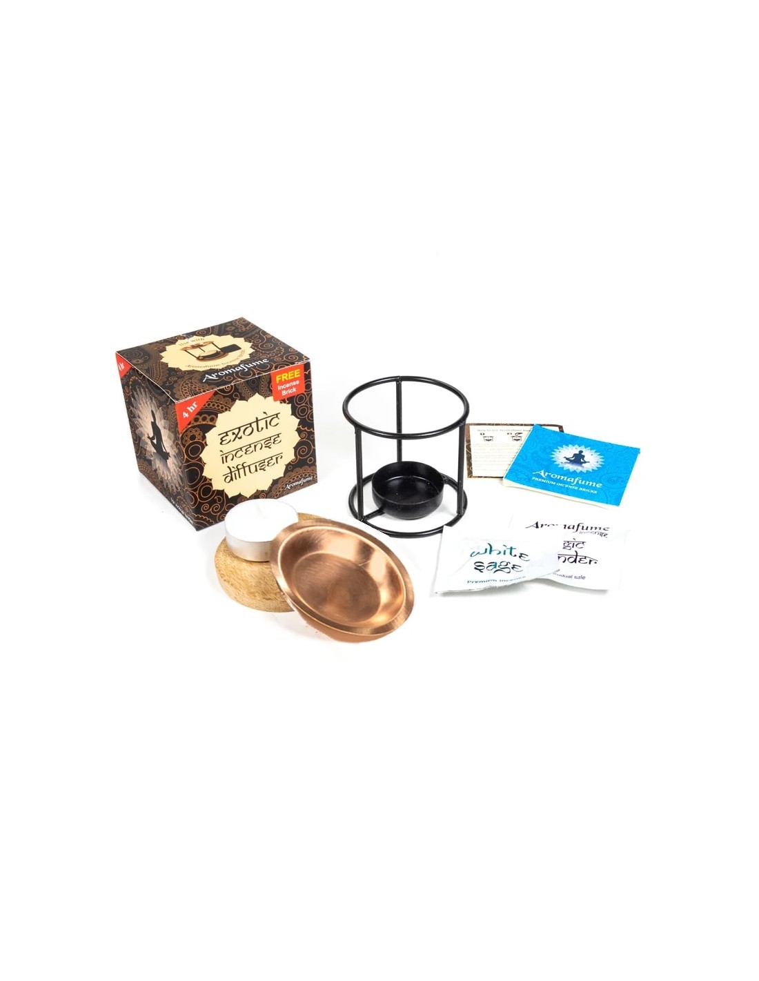 diffusore in ferro battuto, piatto in rame, sottobicchiere in legno, candela, due campioni di mattoncini d'incenso.