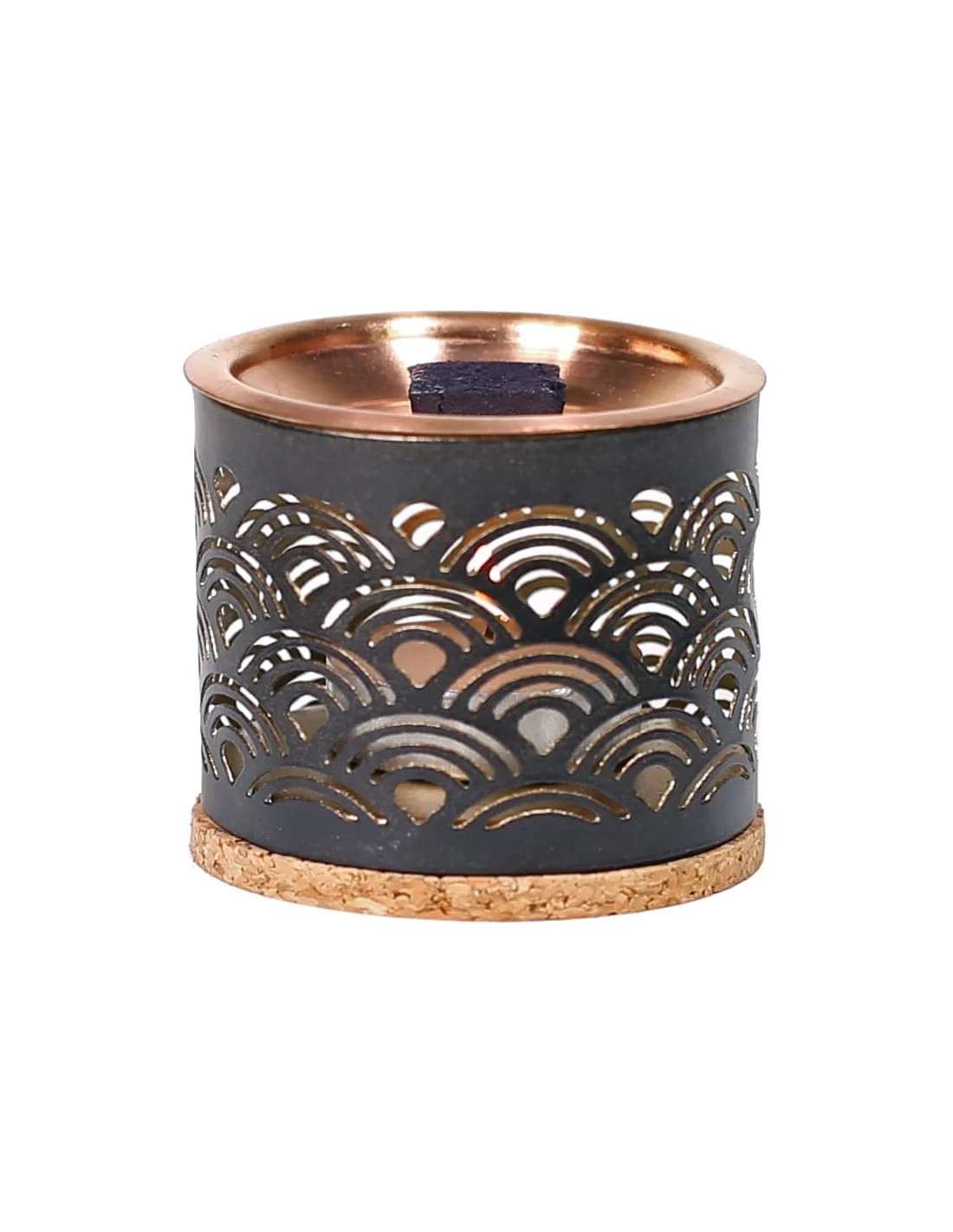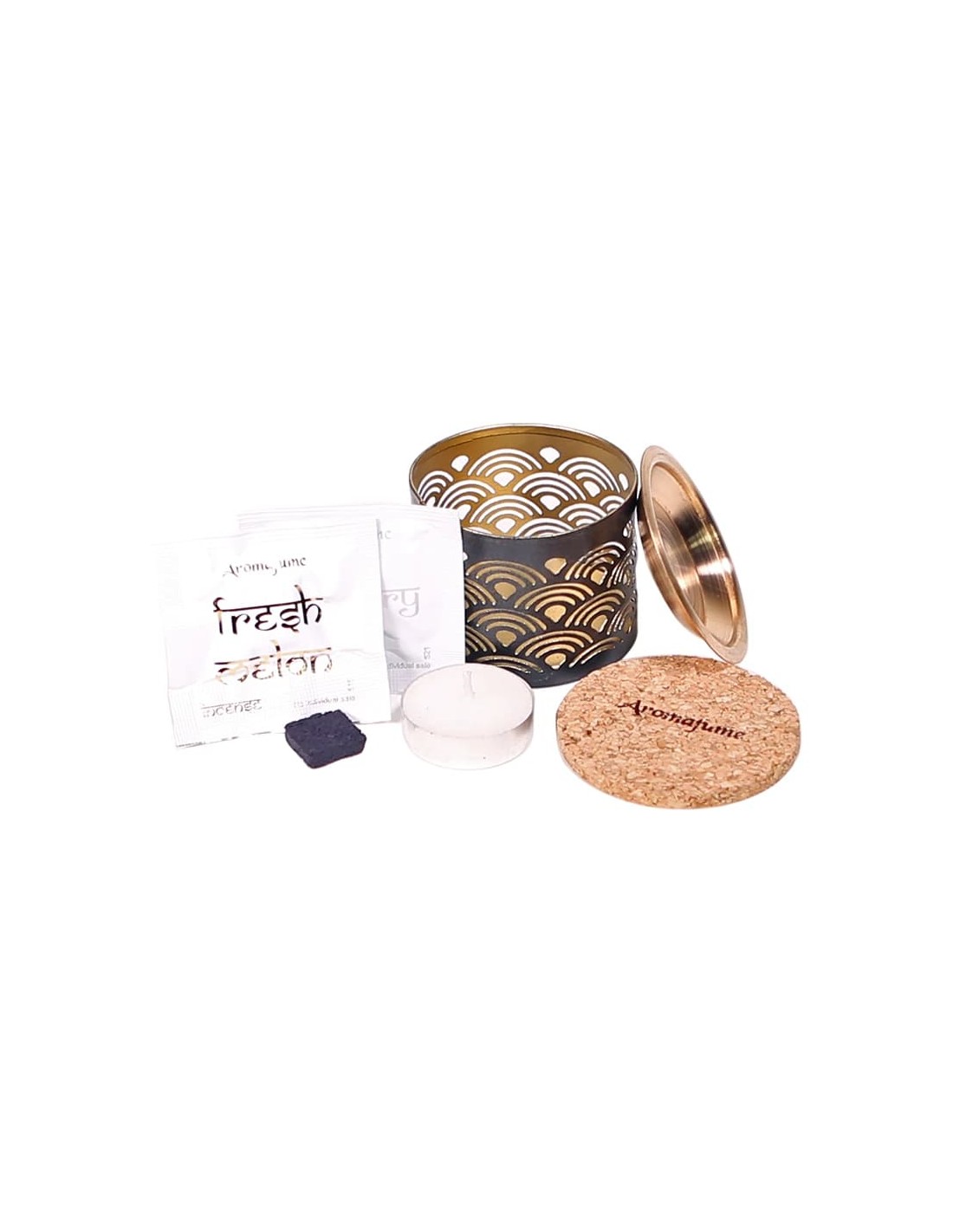 diffusore in ferro battuto, piatto in rame, sottobicchiere in legno, candela, due campioni di mattoncini d'incenso.