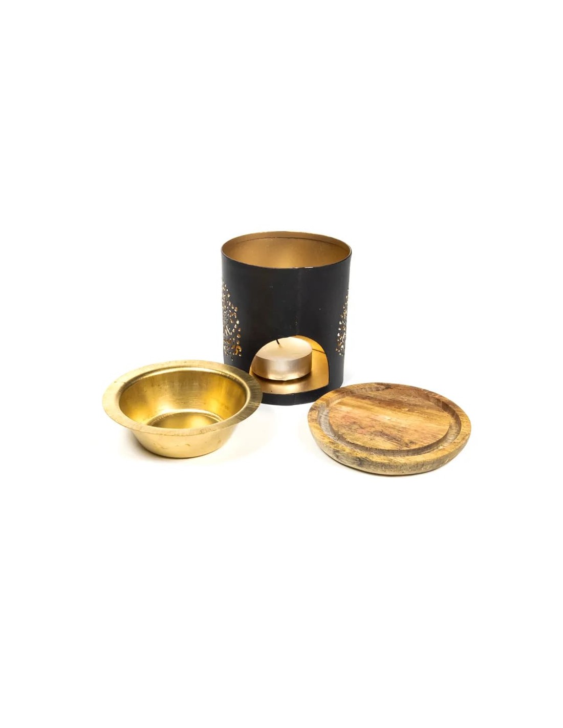 - Brucia essenze in metallo con sottobicchiere in legno con lumino in regslo.