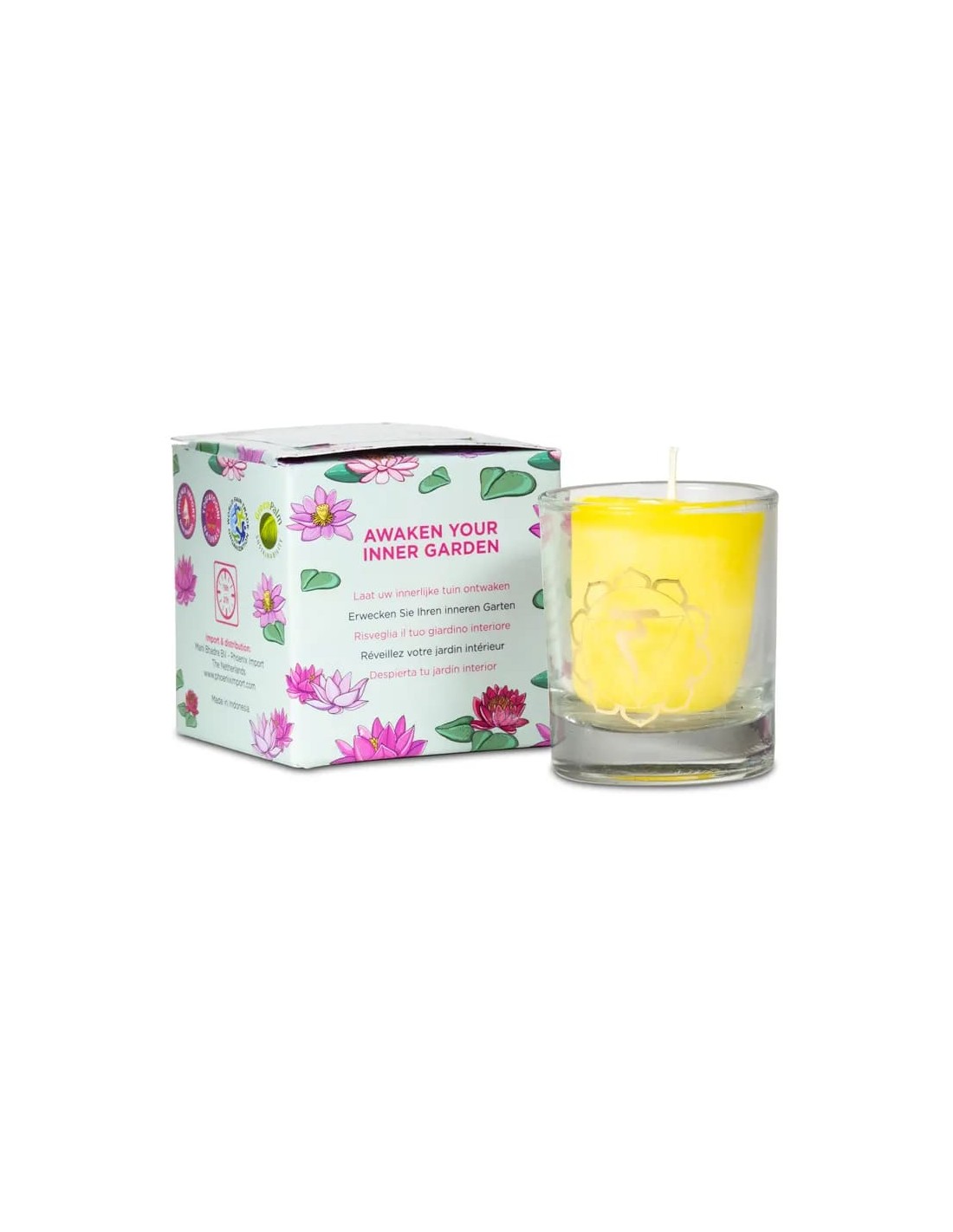 Candela votiva profumata in una confezione regalo davvero unica, stampata con fiori di Loto, simbolo della trasformazione dal buio alla luce.