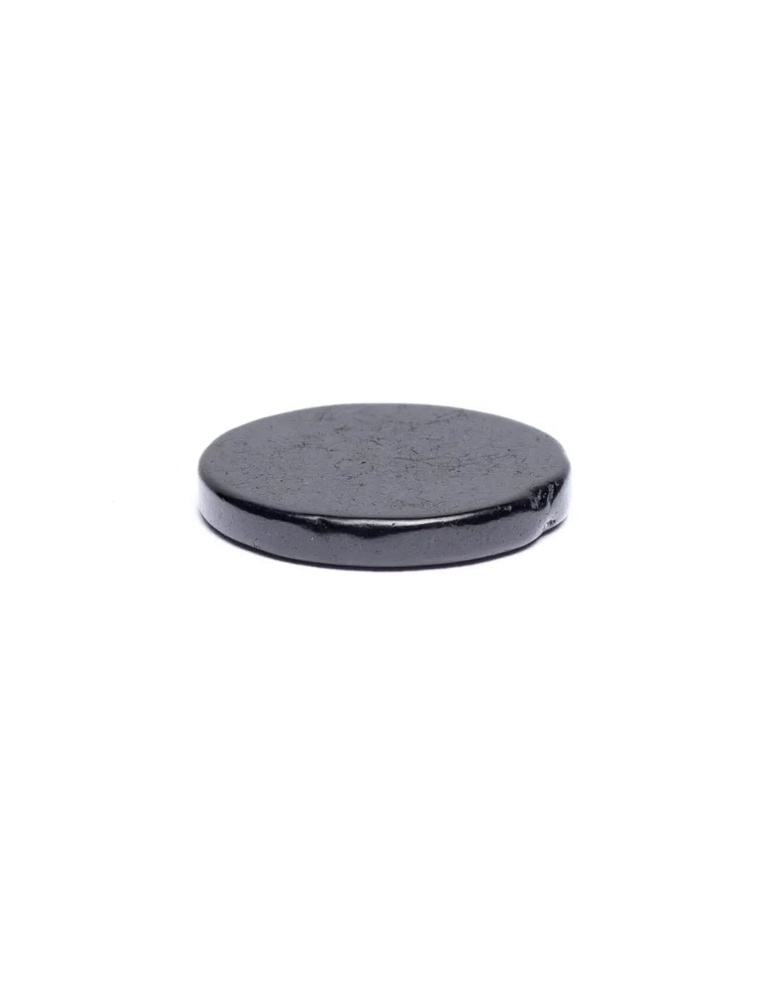 Piatto rotondo levigato in Shungite da attaccare a un telefono cellulare e altri gadget per proteggersi dalle loro radiazioni elettromagnetiche.
