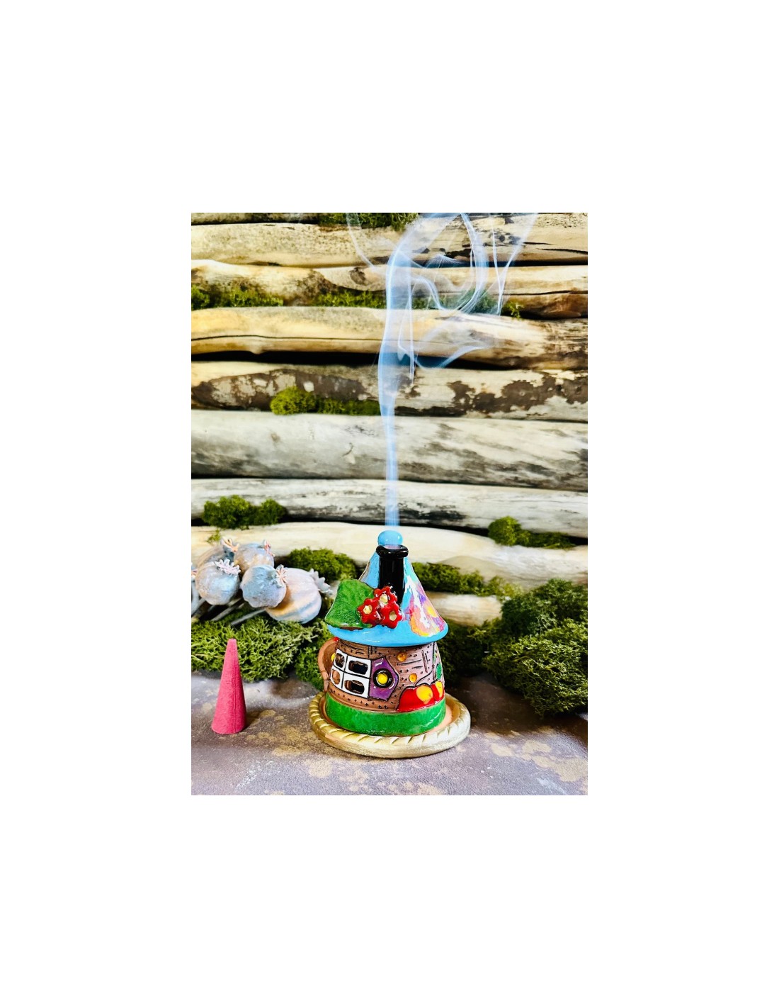 Questa simpatica casetta colorata è un diffusore di incenso a cono creato e dipinto a mano.