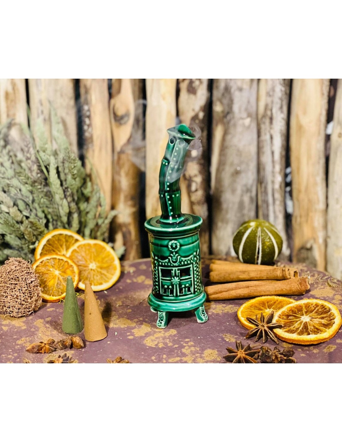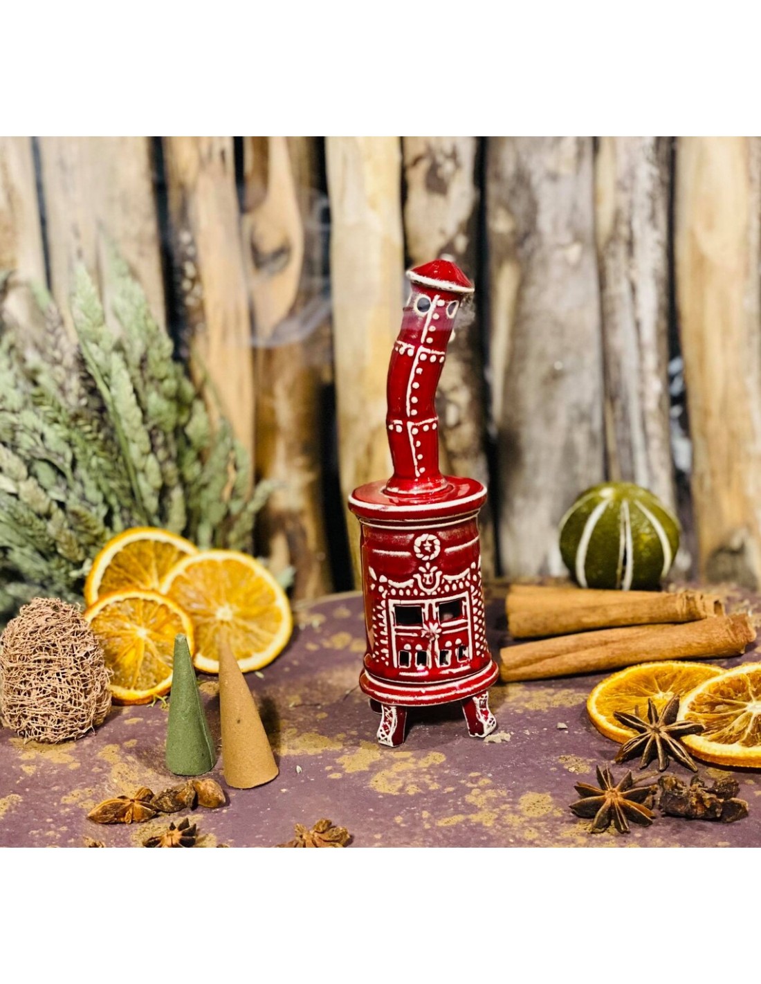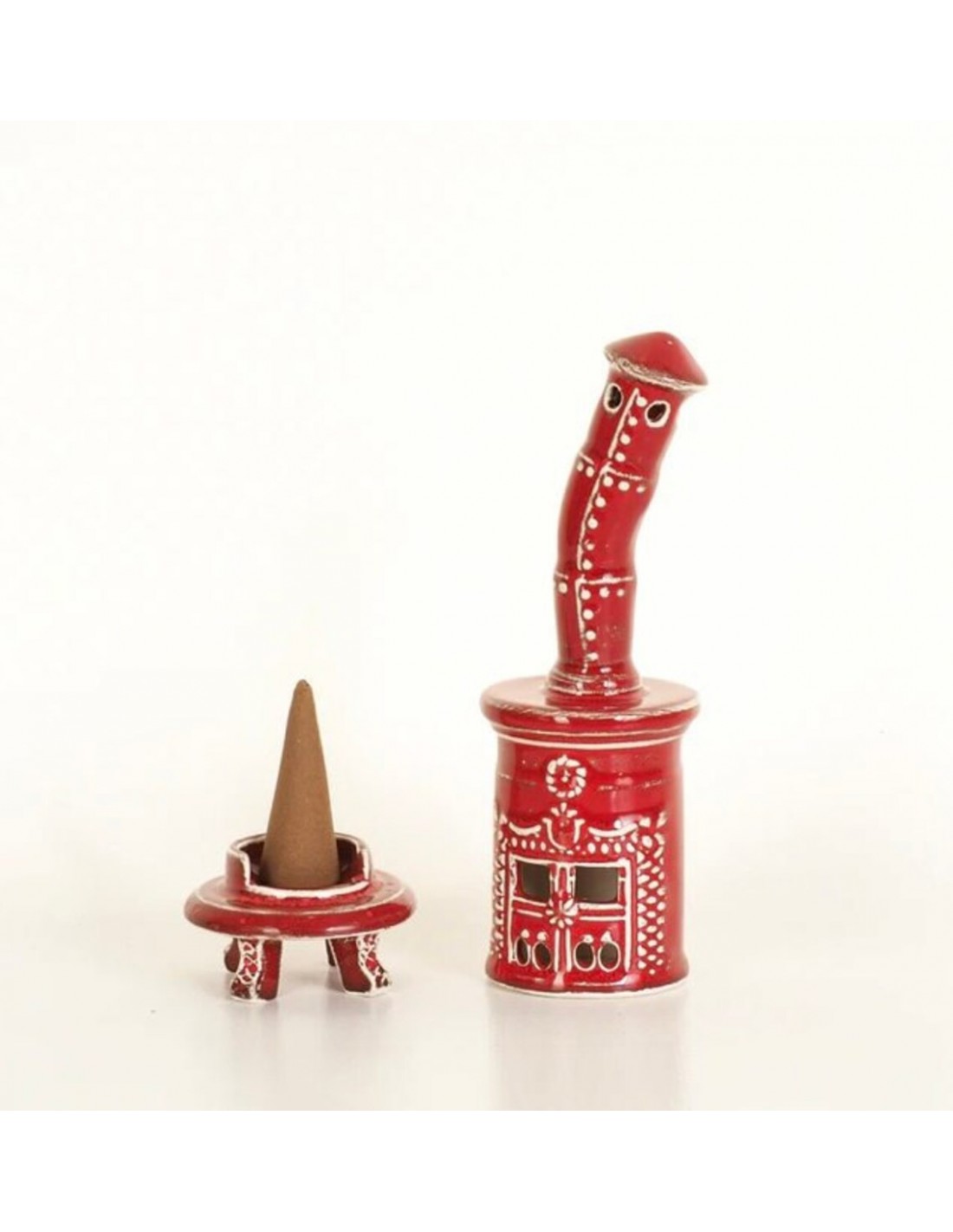 Questa simpatica stufa colorata è un diffusore di incenso a cono creato e dipinto a mano.