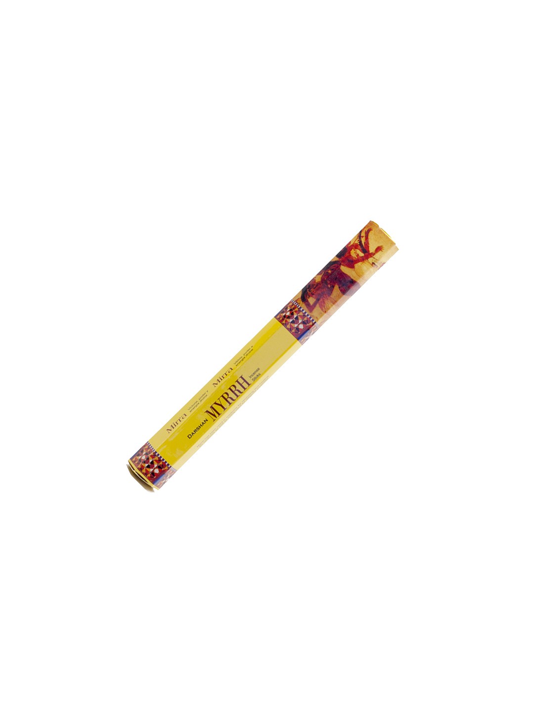 Bastoncini di incenso naturale a base di Mirra (Commiphora myrrha), uno degli aromi più pregiati e utilizzati, dalle grandi capacità balsamiche e purificatrici.