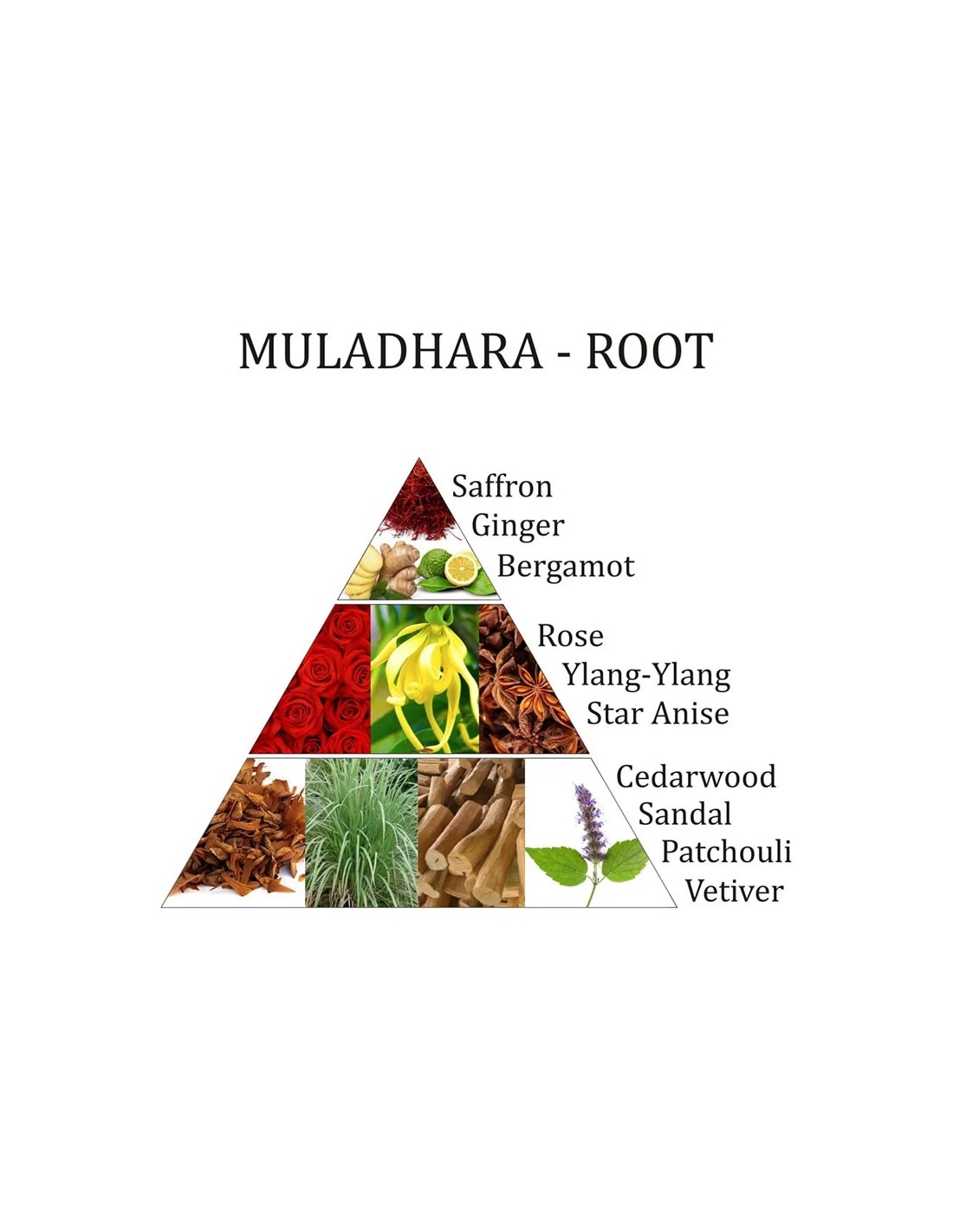 Muladhara - prima gamma di fragranze chakra: Zafferano, Zenzero, Bergamotto, Rosa, Ylang-Ylang, Anice stellato, Legno di cedro, Sandalo, Patchouli, Vetiver.