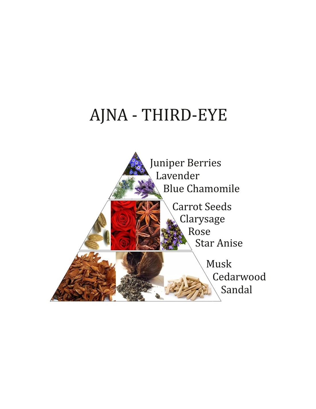 Ajna - gamma di fragranze del sesto Chakra: Bacche di ginepro, Lavanda, Camomilla blu, Semi di carota, Salvia sclarea, Rosa, Anice stellato, Muschio, Legno di cedro, Sandalo.