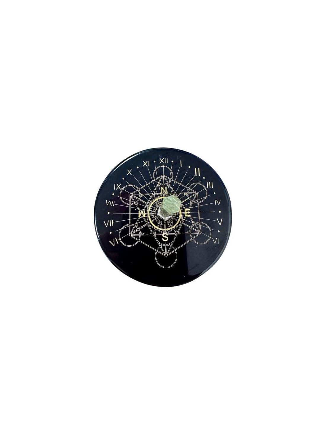 Piatto prendisole in Onice nero stampato oro con prisma in cristallo di rocca.