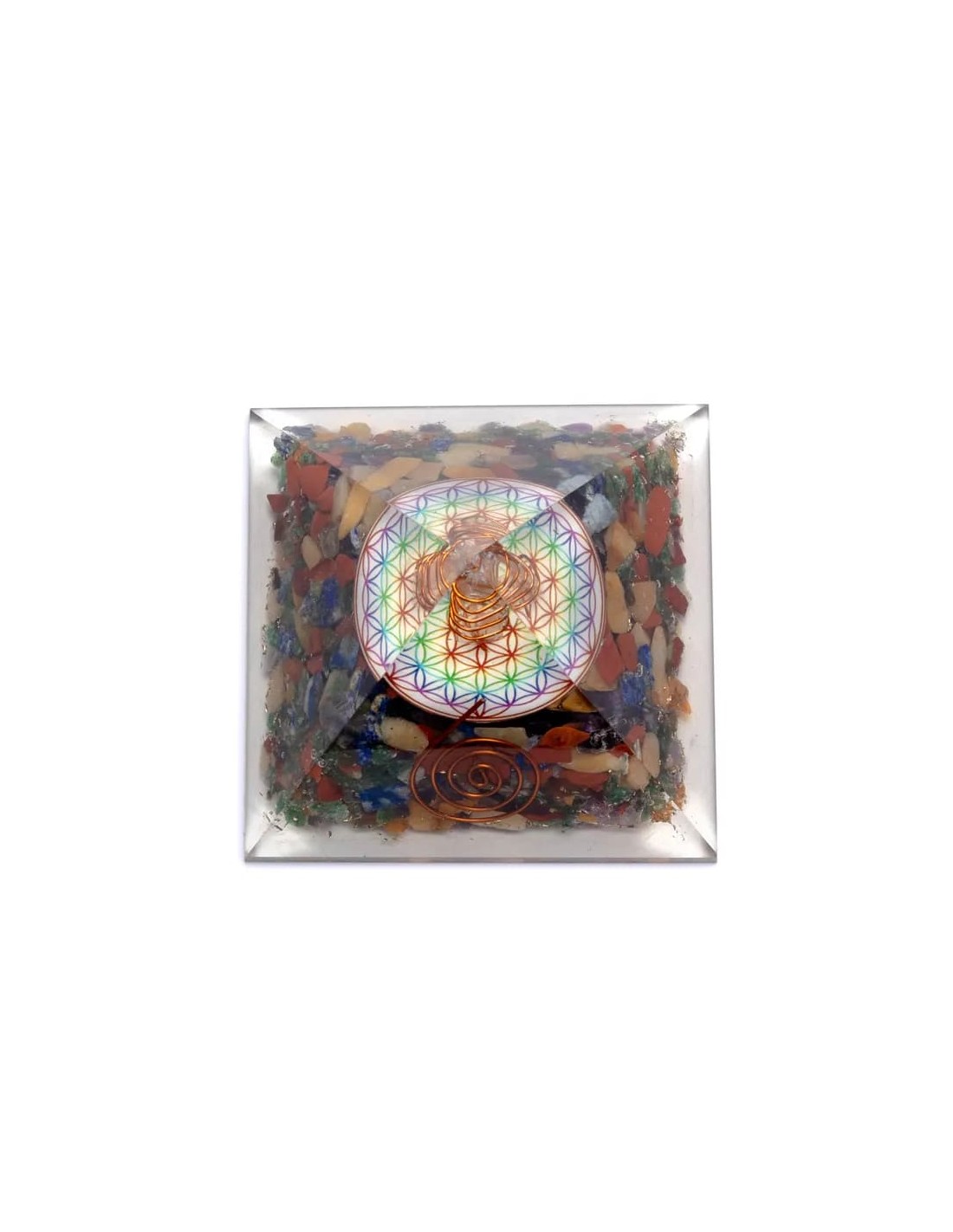Piramide in Orgonite in Tormalina nera con punta in cristallo e Fiore della Vita