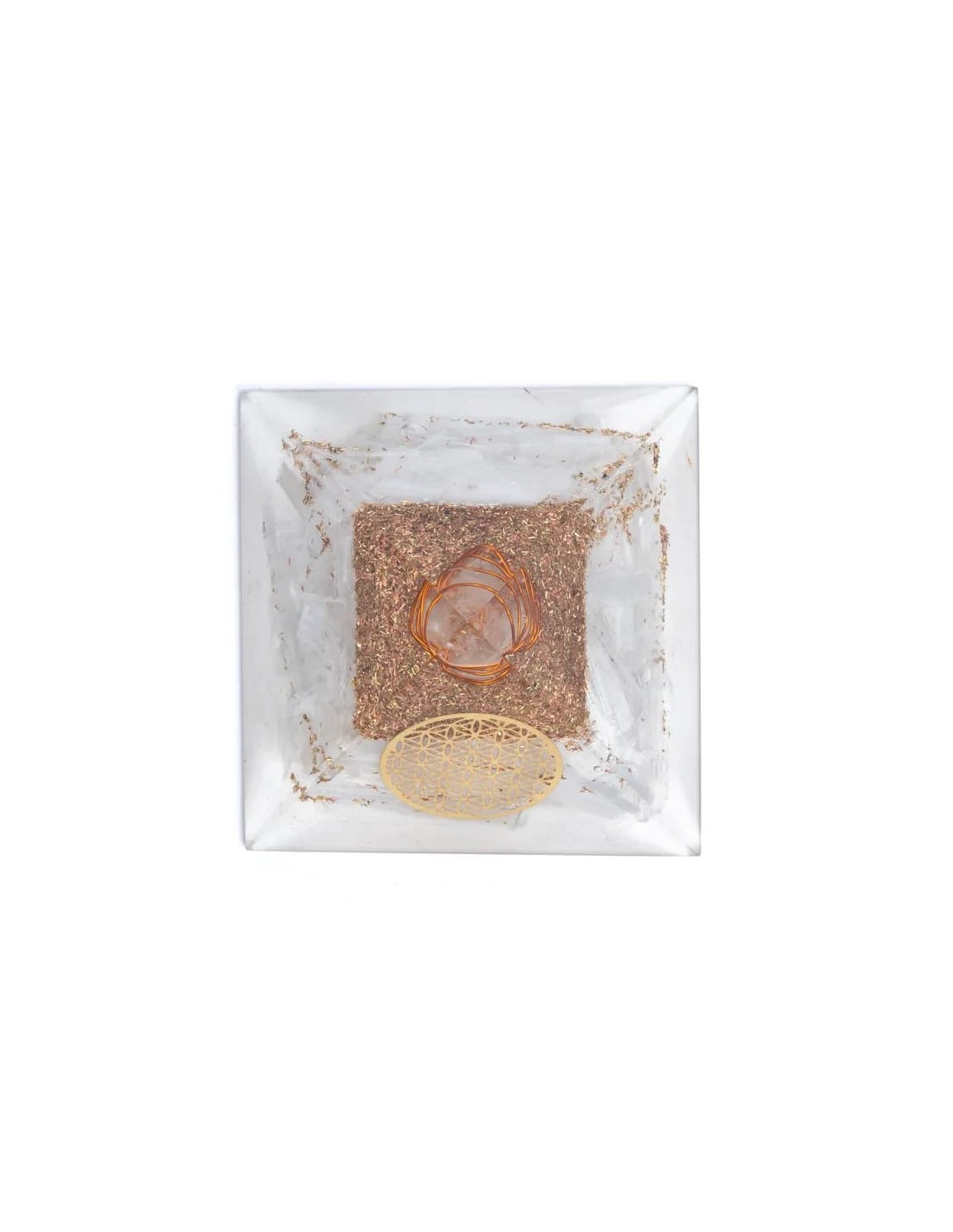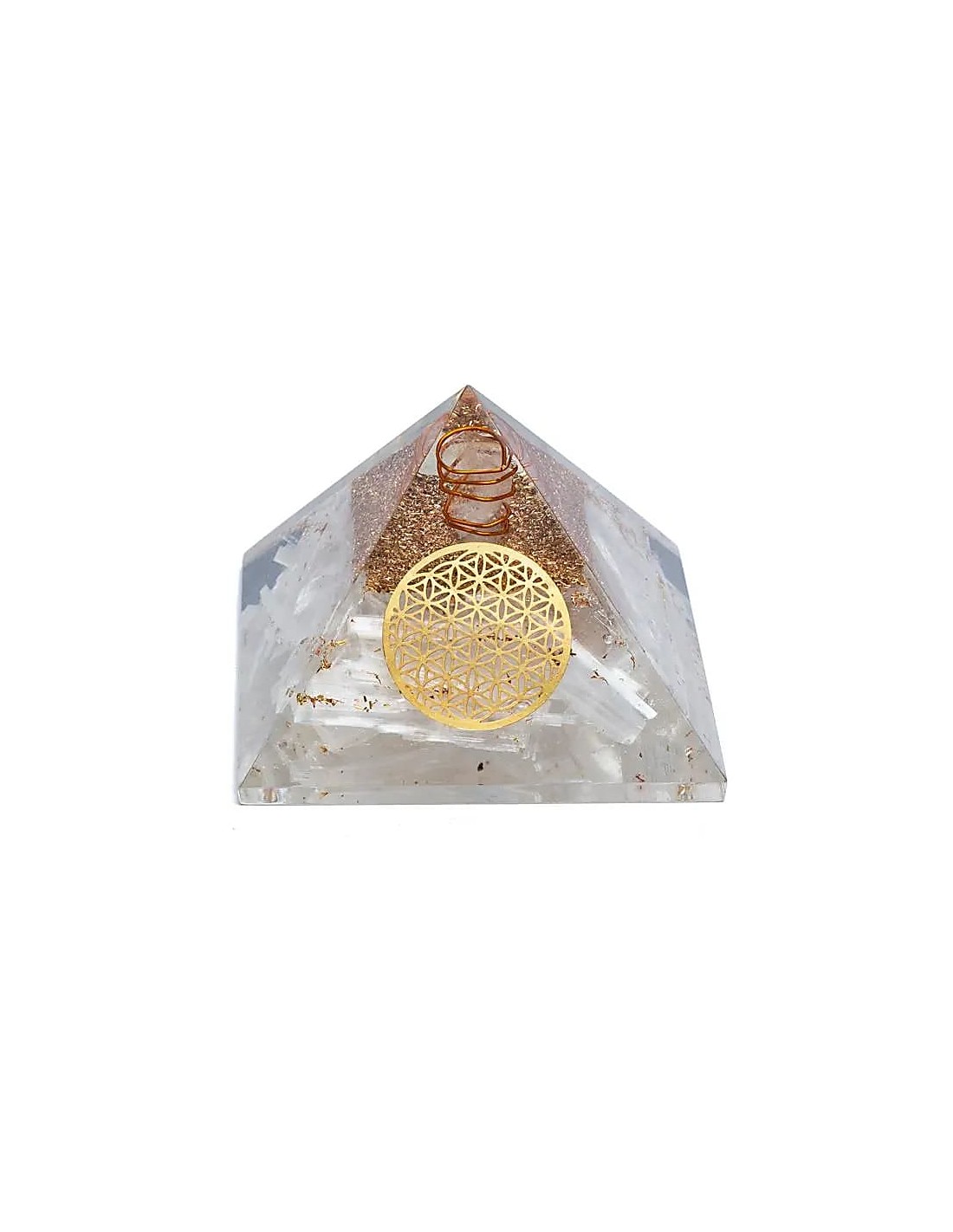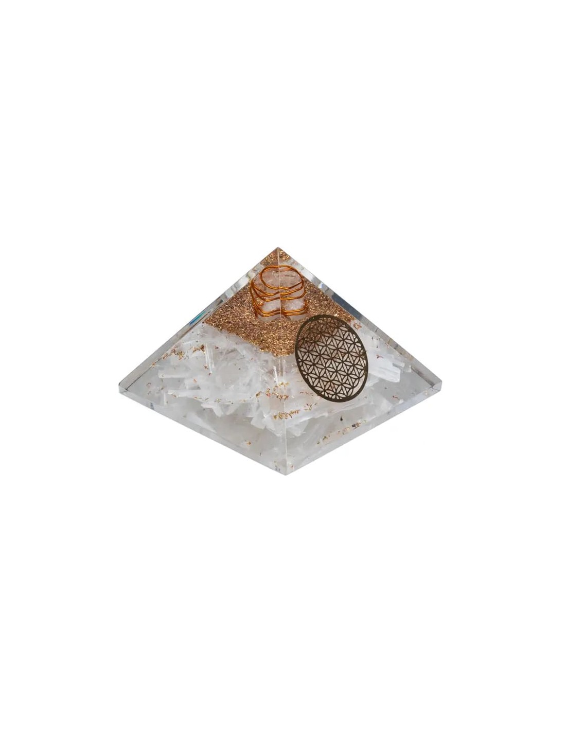 Piramide in Orgonite in Selenite e Fiore della Vita