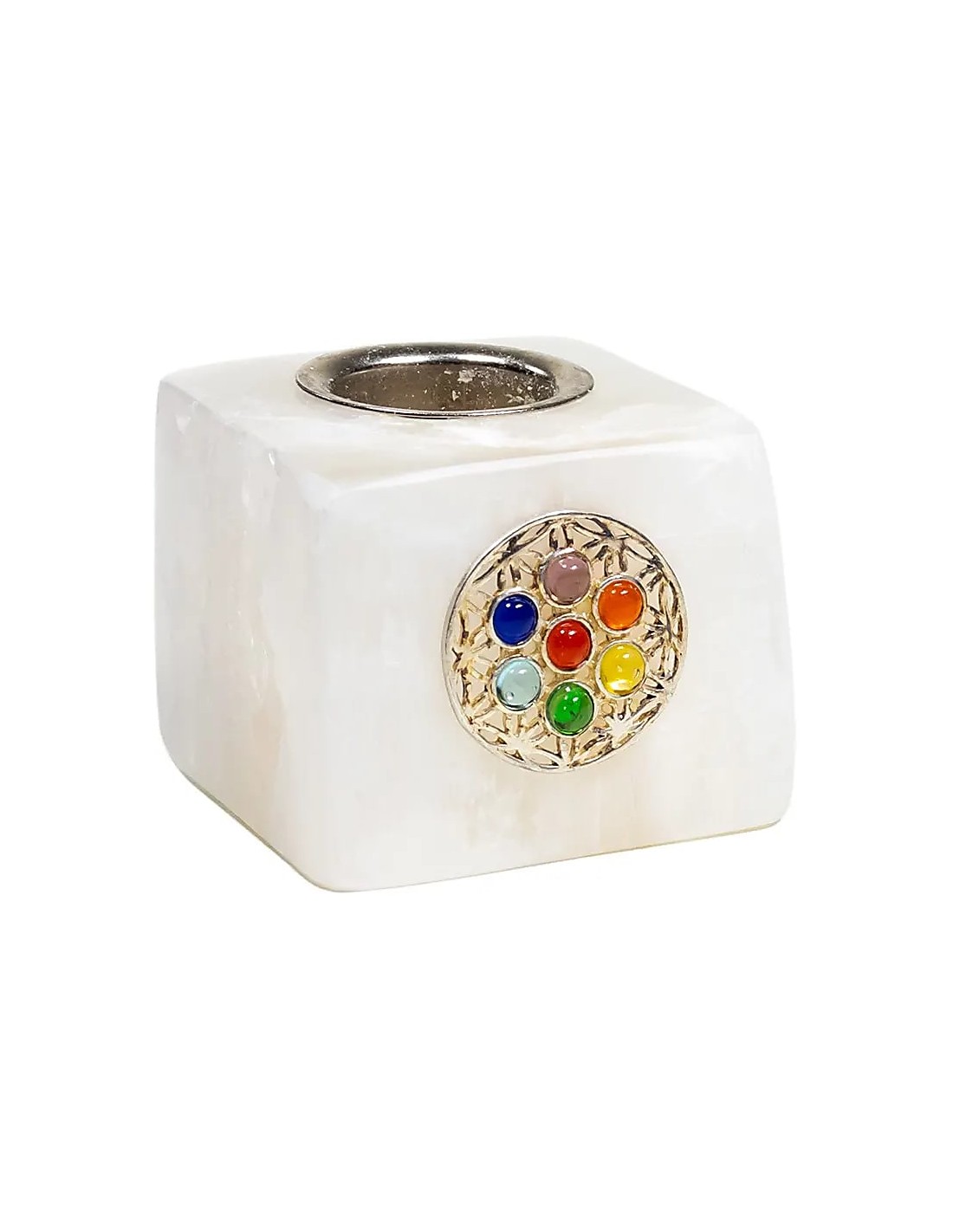 Portacandela a cubo in selenite (Satin spar) con Fiore della Vita