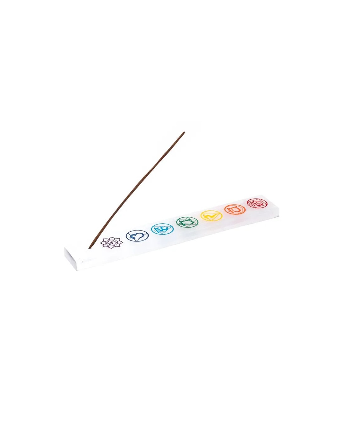 Porta incenso in Selenite con incisi i simboli dei 7 Chakra.