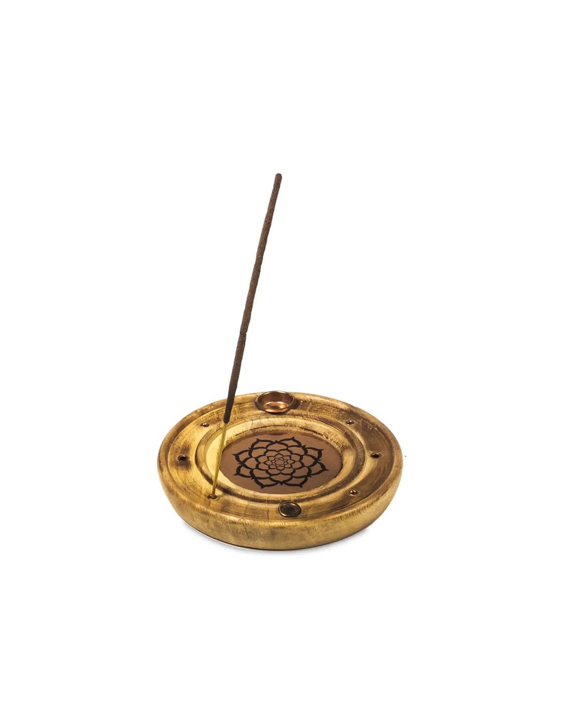Brucia incenso in legno di mango con simbolo del loto in rame.